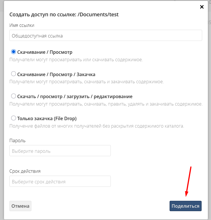 Просмотр / скачивание — пользователи смогут только просматривать и скачивать файлы.